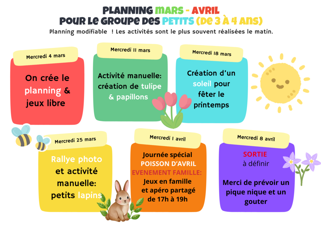 Le premier mercredi de chaque retour de vacances est une journée création de planning avec les enfants, le planning est donc publié la semaine suivante.